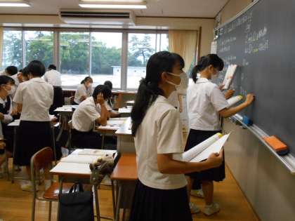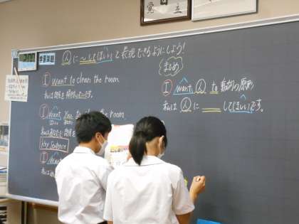 英語の授業では、「人に〜してほしい」という表現ができるように練習をし、黒板に書いて発表する時間もありました。