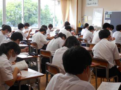 「夏休みの生活日記」が配布され、夏休み中の過ごし方や課題を確認しました。部活動の予定を見ながら、自分の予定を立てている生徒もいました。