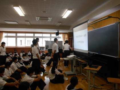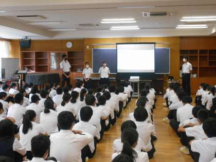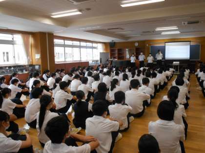 3学年では、学年集会を行い、学年生徒会を中心に1学期の活動の振り返りをしました。学習面と生活面において良かった点と改善点をまとめ、スクリーンを使って発表する場面もありました。また、1学期MVPの表彰もあり、お互いの頑張りを確認することができました。夏休みの過ごし方について、先生の話を真剣にきく姿からは、生徒の決意が感じられました。目標をもって、充実した夏休みにしてほしいと思います。
