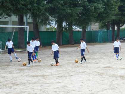 顧問のお手本を見ながらドリブルの練習をしていました。基礎的な技の習得に向けての練習です。