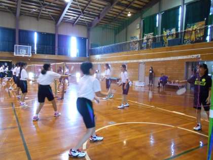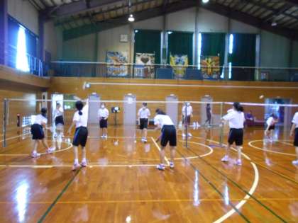 男女ともに、ペアでコートに入り、基礎的練習から始めました。シャトルを打つ表情は生き生きとしており、夏休み初日はよいスタートとなりました。