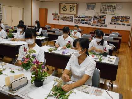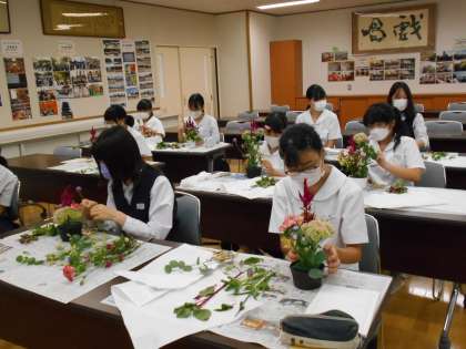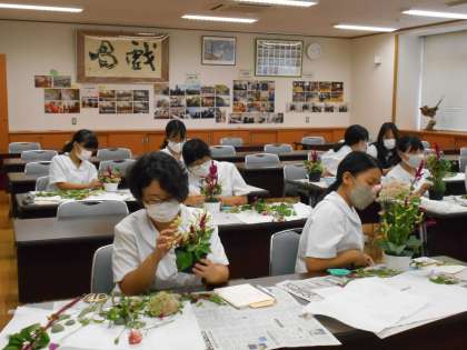 今日は、講師の先生方に来ていただいて、生け花に取り組みました。同じ花材でも一人一人の思いが入ると、仕上がりが違う面白さがありました。文化活動発表会ではもう少し大きな花器で取り組みます。