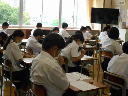 1限から4限の時間を使って、休み明けテストを行いました。1学期の復習範囲ですが、取り組みはどうだったでしょうか。早めにつまずいたところを確認し、もう一度取り組んでも分からなかったところは、どんどん先生に質問しましょう。