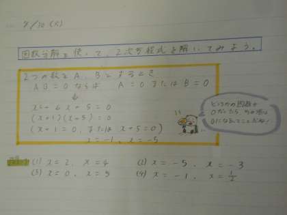 数学の授業は、因数分解を使って2次方程式を解くという内容でした。中には、ノートに分かりやすくワンポイントアドバイスを毎回書いている人もいて、感心しました。