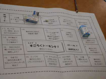 生活班のグループを作り、すごろくで夏休みの出来事を伝え合っていました。もっと詳しく聞きたくなるような話もあったようです。