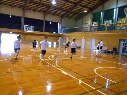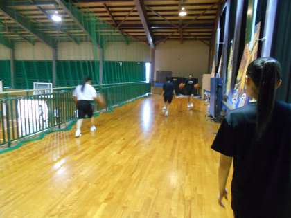 男子がコートを使って練習している間、女子はピロティーを使って、2つのボールを使って両手同時にドリブルする練習をしていました。難しそうでした。