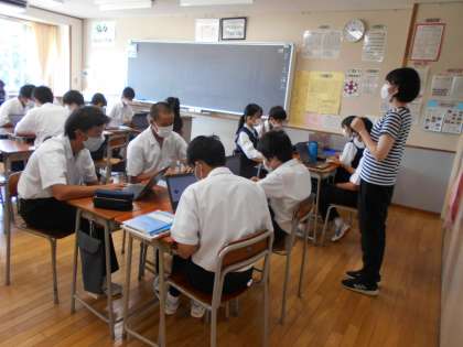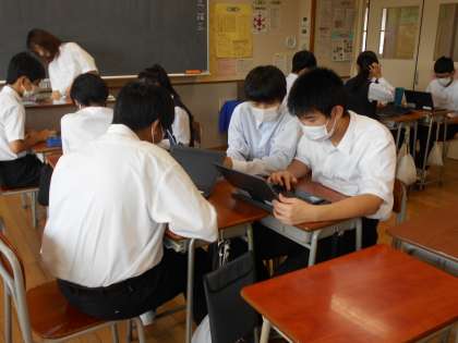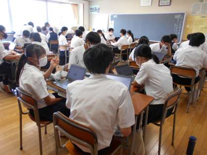 今日の学び愛は美術で、「南中の校章をつくろう!」という課題でした。クロームブックを使って、「校章」をつくりました。担当の先生からは、「校章を作ることが目的ではなく、クロームブックの操作に慣れることです!」と説明があり、「こんな機能があるんだね。」など、試行錯誤しながら作成していました。