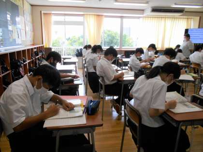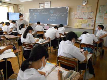 英語の授業では、What time〜?を使って、どんなことが聞きたいかを考え、問答する準備をしました。