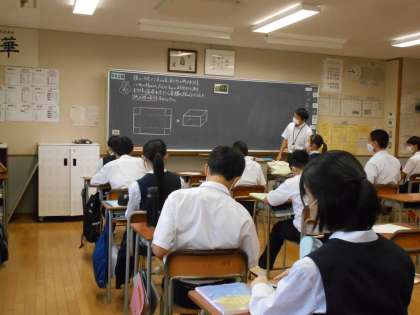 数学の授業では、横が縦より4センチ長い長方形から、一辺3センチの正方形を切り取った紙で立方体を作った場合、設定された容積から紙の縦の長さを求めることに取り組みました。一人では求められなくても、教え合うことでなんとか乗り越えました。