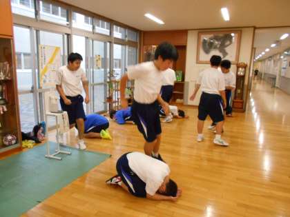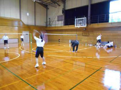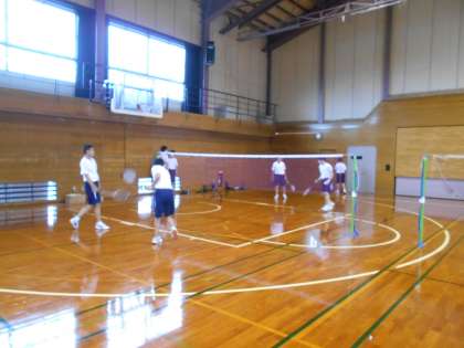 男女バドミントン部は、コートでの練習をするグループと、生徒玄関エコスペースでトレーニングやユニフォーム決めをするグループに分かれて活動しました。