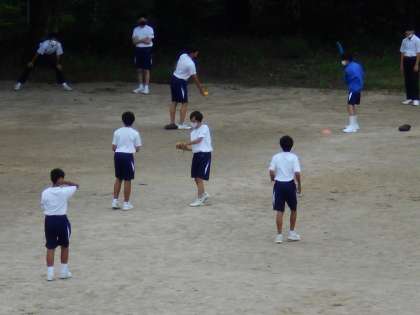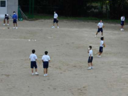 男子保健体育の授業では、ソフトボールに取り組んでいます。グラウンドに広がって、守備練習をしました。