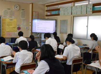 英語の授業では、「〜してうれしかった、悲しかった」という表現が使われたListening問題に取り組み、隣の人と答を確認し合っていました。