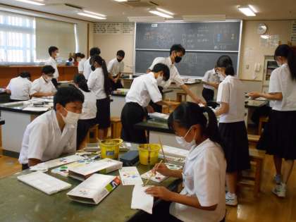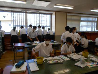 美術の授業では、ポスターカラーの使い方をマスターしようという学習課題で、色の混ぜ方や水の混ぜ方等、いろいろやってみました。