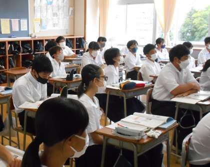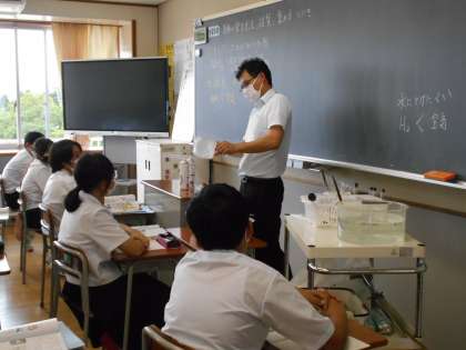 理科の授業では、気体の発生方法、性質、集め方について勉強しました。ミニ実験もあり、空気より軽い気体が入ったビニール袋が天井まで上がると、大きな歓声が上がりました。
