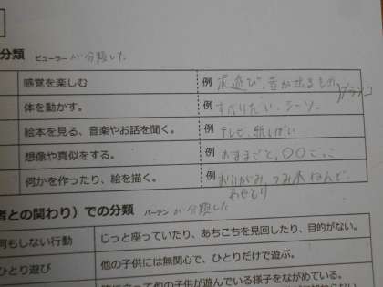家庭科の授業では、遊びを分類して、特徴について考えました。幼児が遊ぶ映像を見て、「あ〜、わかる!」と自分の経験を思い出しながら、取り組んでいました。