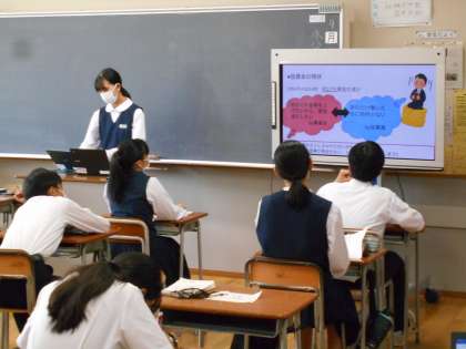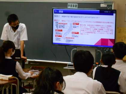 総合的な学習の時間は「よりよい社会をめざして」の発表を行いました。夏休み中にそれぞれが準備したスライドを用いて発表しました。グラフやイラストを用いて、見やすく工夫して作成している人も多くいました。発表を聞いて、初めて知ったことや、新しく気づくことが多くあって勉強になったという感想もありました。
