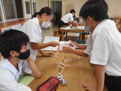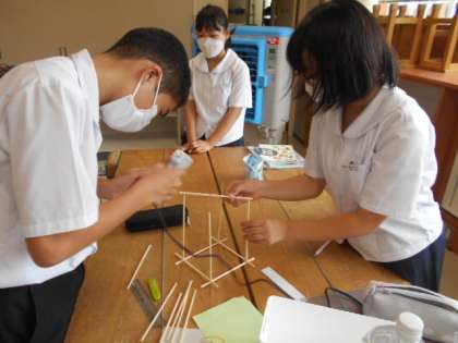 技術の授業では、割り箸を利用して、2リットルのペットボトルを置く土台を作っています。限られた割り箸を材料に、班員で協力して、丈夫な土台を考えていました。