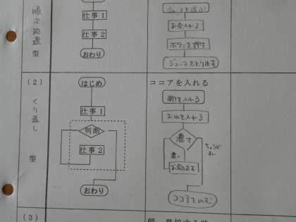 技術の授業では、これからプログラミングについて勉強します。今日は身近な日常生活を例に、フローチャートを書いてみました。