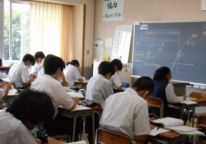 数学の授業では、1次関数のグラフの特徴を考え、各自ノートにまとめました。