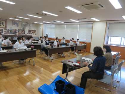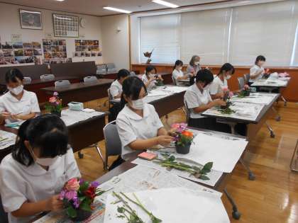 本日、家庭・文芸部では、2名の講師の先生に来校していただき、フラワーアレンジメントに挑戦しました。今回は、10月15日(土)に開催される文化活動発表会の作品展示の練習です。講師の先生からのアドバイスを受けながら、フラワーポットに生けました。当日も作品も楽しみです。
