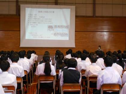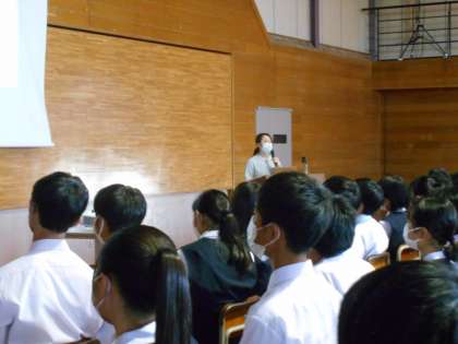 昨日、昨年度に引き続き、今年度も富山大学付属病院 産科・婦人科に勤務されている森田先生をお招きし、講演していただきました。性に関する悩みやトラブルの解決方法、性感染症やその予防についてお話していただきました。トラブルを避けるため、自分の意思をしっかりともち、相手に自分の気持ちをはっきり伝えることが大事であることを教えていただきました。「どんな性でも幸せになる権利がある」というお話もあり、生徒たちは、真剣に話を聴いていました。