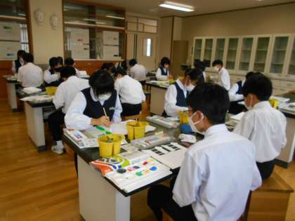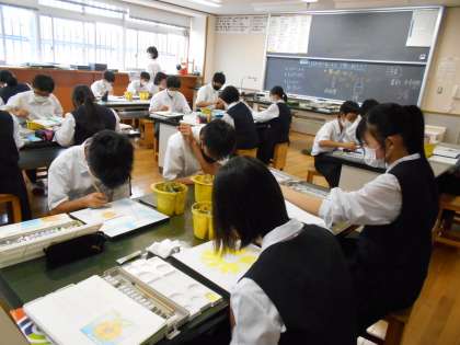 美術の授業では、デザインされた文字をパネルに描いています。今日もはみ出さないように気を付けながら、色を塗りました。