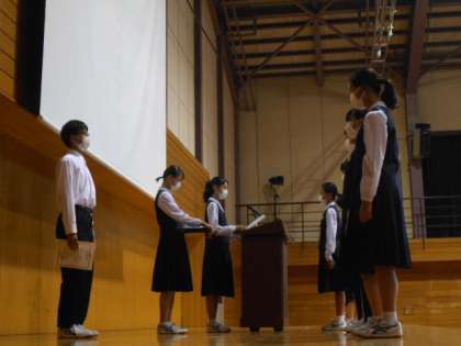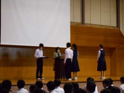 前期生徒会活動報告会終了後、校長先生から後期生徒会の会長および副会長に認証状が、生徒会長から執行委員および専門委員長に任命書がそれぞれ授与されました。