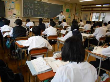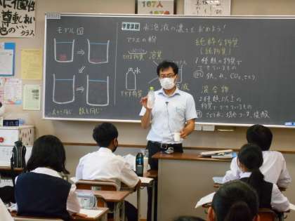 理科の授業では、水溶液の濃さを求める授業でした。水に溶質に当たる物を入れ、デモンストレーションをする姿に、興味津々でした。