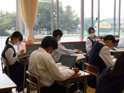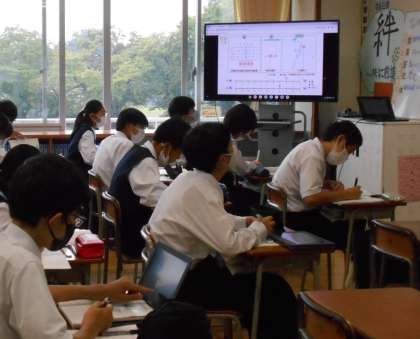 数学の授業では、1次関数の式を求めるために必要な条件を、Chromebookも活用しながら考えました。