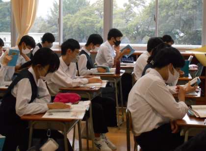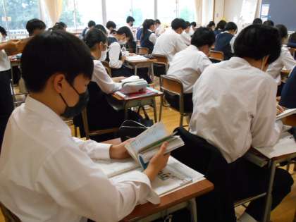 英語の授業では、単語帳を使って単語の練習をしました。声に出して繰り返し読むことで、定着していきます。家でも取り組みましょう。