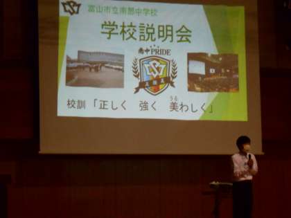 統一公開日の今日、2学年生徒会と部長が、南部中学校の学校紹介を行いました。