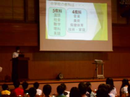 はじめの挨拶の後、南部中学校の1日の様子を紹介しました。中学校の教科や授業で心がけていることも紹介しました。