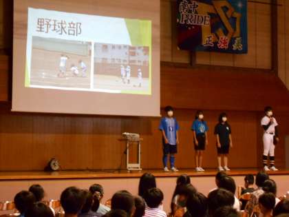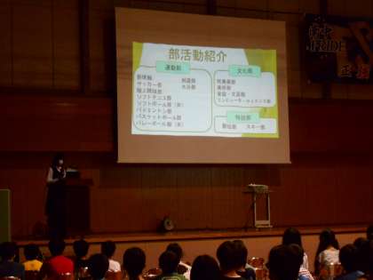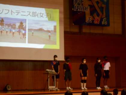 続いて、部活動の紹介を行いました。今年度は部活動見学がないため、部活動の部長が、それぞれの部の見所を紹介しました。ユニフォーム姿や楽器、作品等を持って紹介した部もありました。