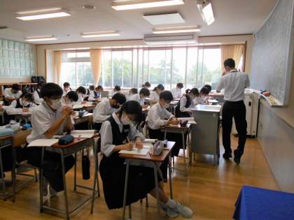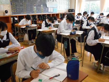 数学の授業では、1次関数のグラフから直線の式を求める問題にたくさん取り組み、基礎の定着とともに応用力のアップを図りました。