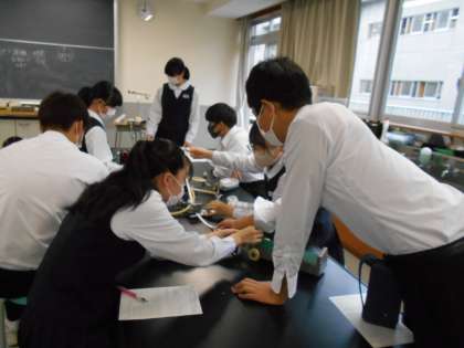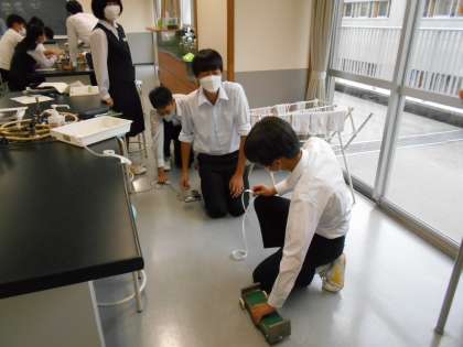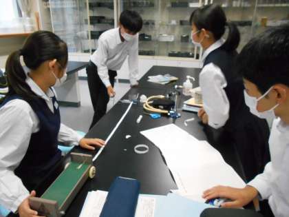 理科の授業は、水平な面上で台車を押したときの運動の様子を調べる実験でした。記録タイマーの記録を真剣な面持ちで確認していました。