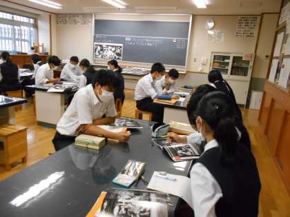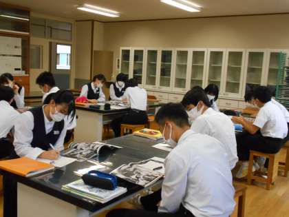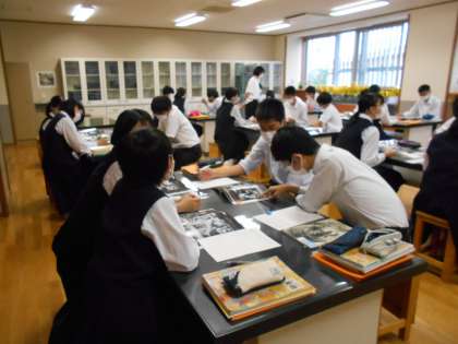 美術の授業では、「ゲルニカ」を鑑賞して、どう思ったか、どんな場面だと思ったかについて、グループごとに意見交換することで、なぜこの画が描かれたかに迫っていきました。
