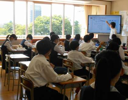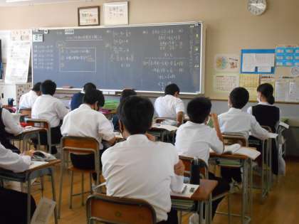 数学の授業では、黒板とテレビに映した教材を併用して授業を進めています。テレビ画面があると、より姿勢がよくなり、集中しています。