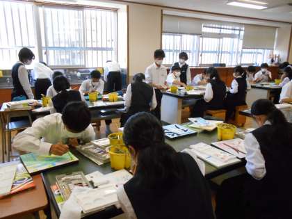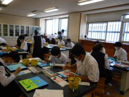 美術の授業では、パネル制作が進んでいます。下書きの線からはみ出さないように、慎重に着彩しました。