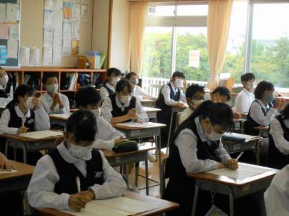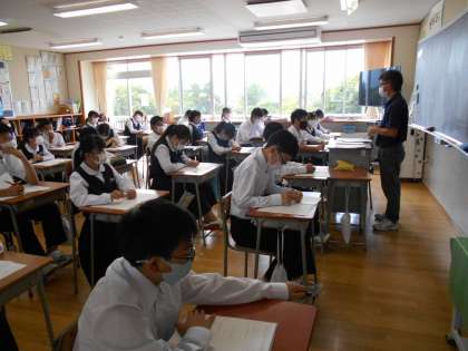 数学の授業では、中間評価の復習をしており、答え方について1つ1つ丁寧に解説がありました。家でも、もう一度見直しておきましょう。