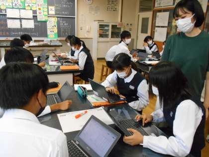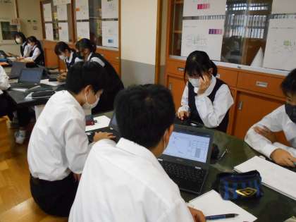 美術の授業では、各専門委員会のロゴマーク作りが進み、Chromebook上で、班員のアイディアに対してアドバイスをしました。いろいろな工夫が見られ、どんなものに決定するのか楽しみです。