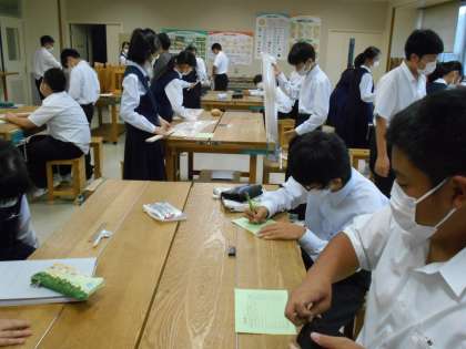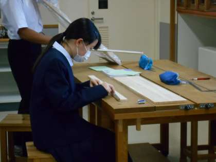 技術の授業は、本立て制作に入りました。今日はまず、板にカットするための線を引くことからスタートし、最後に振り返りカードを書きました。