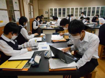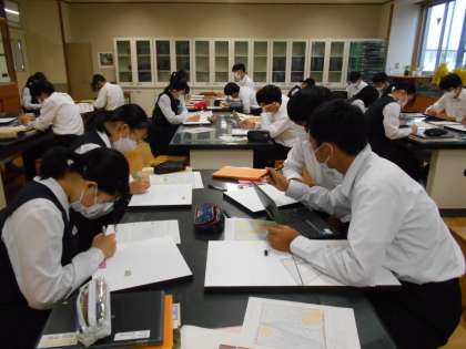 美術の授業では、「この窓をのぞいて」というイメージで、窓の外の景色を自由に思い描いています。今日は、構図の下書きをしました。