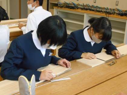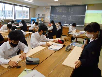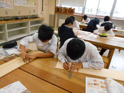 技術の授業では、「板に部品をけがく」ことに取り組みました。