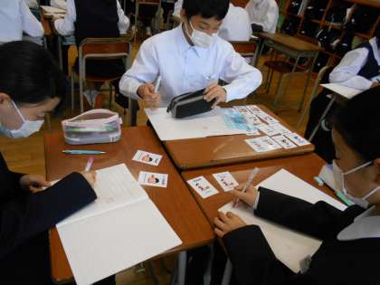 英語の授業では、カードゲームで動詞に付けるs/esの練習をした後、ノートに英文を書いて復習をしました。カードを使うことで、とても分かりやすかったようです。