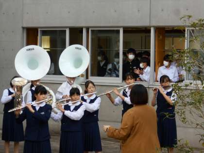 本日、昼休み時間に中庭で吹奏楽部のミニコンサートを行いました。