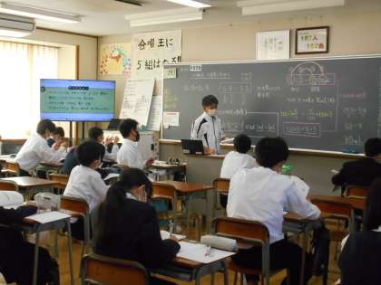 数学の授業では、比例式の性質について勉強しました。先生の問いにすぐに答え、取り組んでいました。