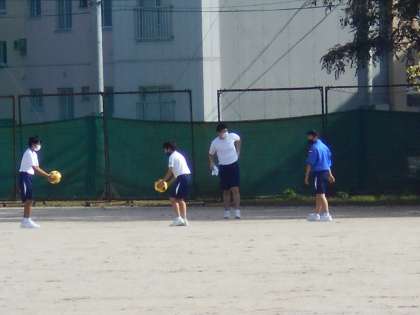 男子保健体育の授業はサッカーでした。2人が組になり、リフティングやパスの練習をしました。