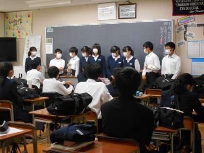 合唱コンクールを終えて、リーダー一人一人がこれまでの思いを伝えクラス全体に伝え、大きな拍手が起こっていました。担任の先生からもたくさんのメッセージが語られ、真剣に聴いていました。