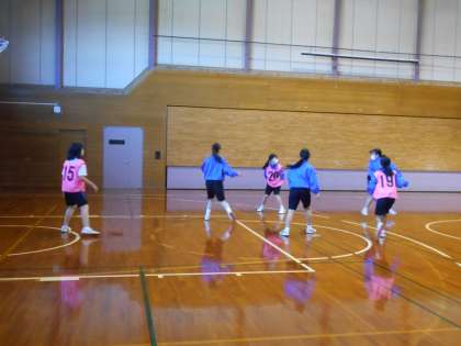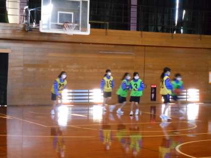 女子保健体育はバスケットボールに取り組みました。今日は、班分けをしっかり意識できるようにビブスを付けて練習しました。