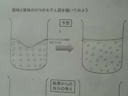 理科の授業では、ロウの状態の変化前後の質量や体積の変化を予想し、次回の実験に備えました。